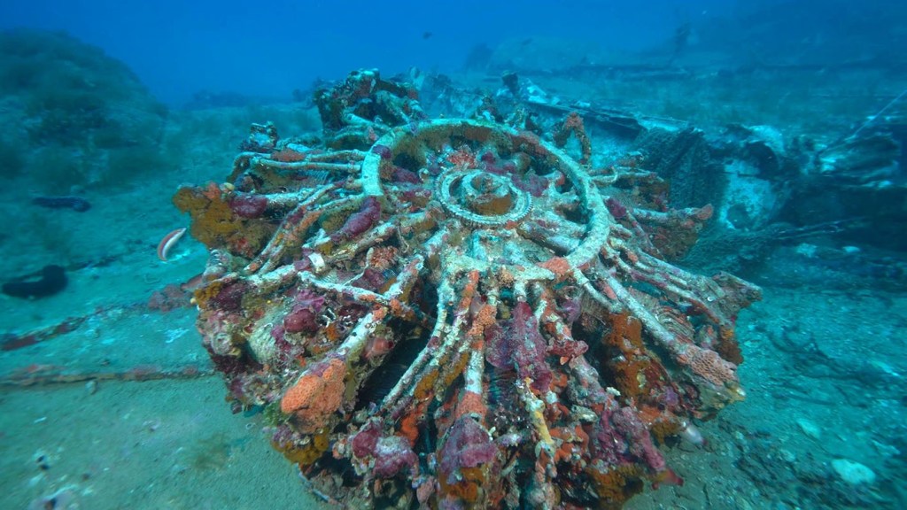 Immersione in mare, fondali chiari, macchina fotografica subacquea ed ecco che il mare siciliano di San Vito Lo Capo restituisce un altro pezzo di storia. Dalle sabbie, coperto da incrostazioni ecco un motore radiale a 14 cilindri, del tipo a doppia stella, sicuramente un Pratt & Whitney R-1830, prodotto negli Stati Uniti tra la metà degli anni 30 e la fine degli anni 40 del 1900. I resti di cui fa parte sono quelli di un bimotore statunitense o britannico della Seconda Guerra Mondiale.