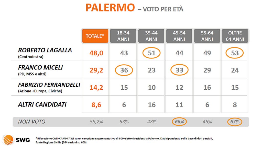 Sull’età degli elettori, pare molto forte la quota dei 35-44enni e degli oltre 64enni a favore di Roberto Lagalla.
