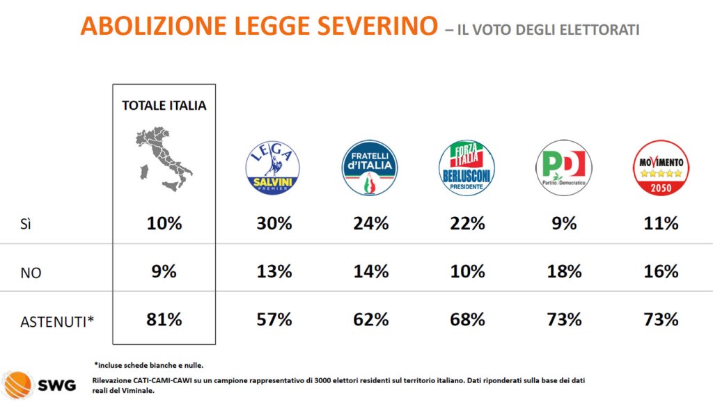 Per il quesito 1 sull’abrogazione della Legge Severino riguardante l’incandidabilità, l’ineleggibilità e la decadenza automatica per parlamentari, dei rappresentanti di Governo, dei consiglieri regionali, dei sindaci e degli amministratori locali in caso di condanna… gli astenuti variano dal 57% tra gli elettori della Lega, al 73% di quelli del PD e M5S. Questo quesito era condannato a prescindere.