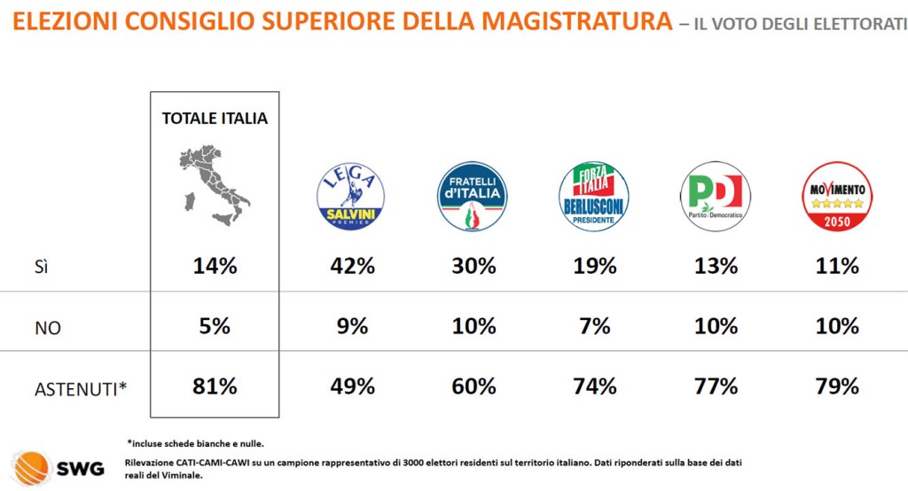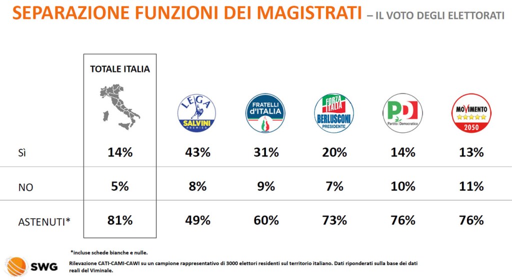 I quesiti referendari che sono andati un po’ meglio sono stati il 3 e il 4, separazione delle funzioni dei magistrati e sulla partecipazione dei membri laici (professori universitari in materie giuridiche e avvocati) a tutte le deliberazioni del Consiglio direttivo della Corte di Cassazione e dei consigli giudiziari: astensionismo sempre alle stelle, dal 49% dei leghisti al 76% di PD e M5S per il quesito 3 e al 79% del M5S per il quesito 4.
