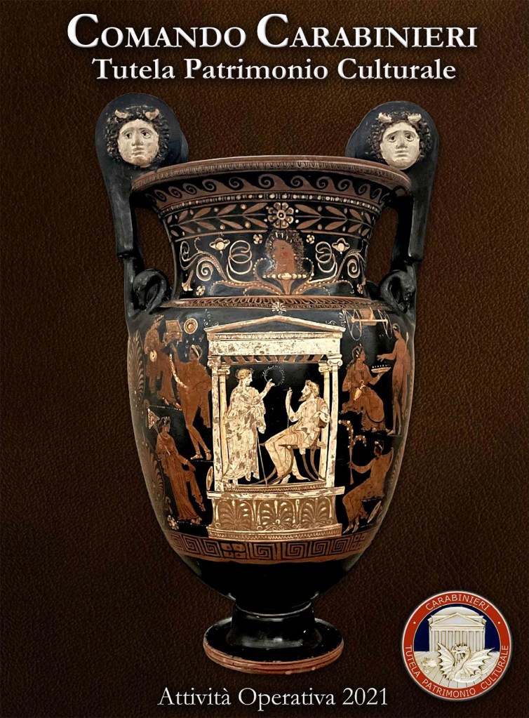 Nel complesso delle tante opere ritrovate campeggia lo splendido Cratere apulo a volute (messo a copertina del rapporto sull’Attività Operativa 2021), oggetto risalente al IV secolo a.C., trafugato grazie a scavi clandestini portati avanti da tombaroli nell’Italia meridionale, recuperato poi negli Stati Uniti dove era finito tramite le rotte del mercato internazionale della ricettazione.