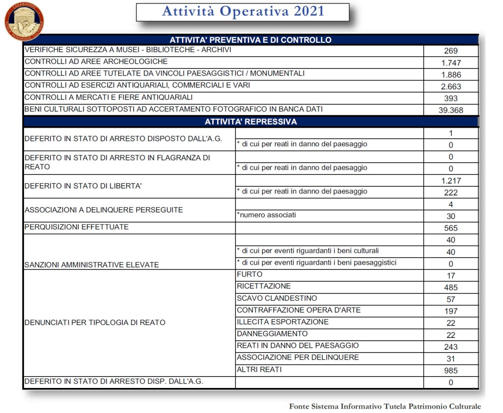 Nel dossier “Attività Operativa 2021” i numeri parlano chiaro: i militari hanno recuperato 33.869 beni d’arte, in gran parte reperti archeologici, paleontologici e numismatici per un totale di 23.607 pezzi. Pio i beni antichi, archivistici e librari per 10.262 oggetti.