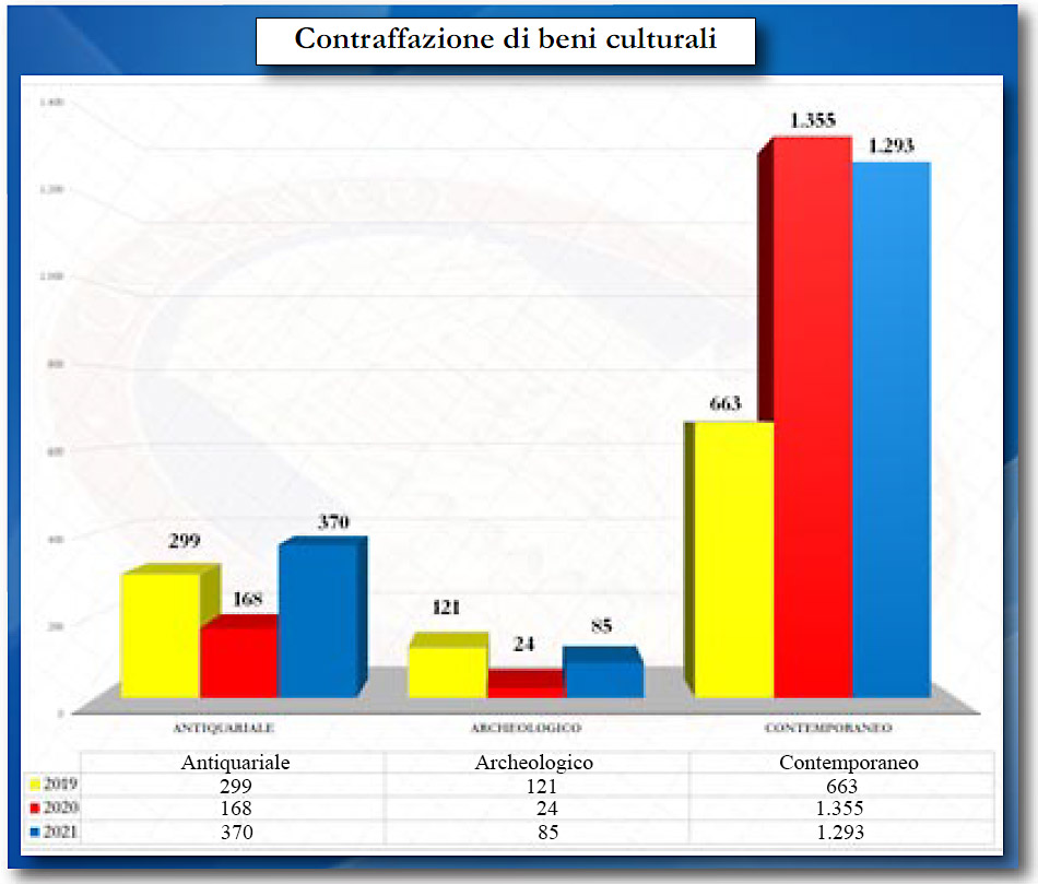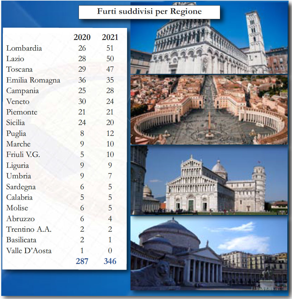 Come sottolineato dal Comando dei Carabinieri TPC, rispetto agli anni precedenti c’è un andamento in senso contrario, in crescita con un aumento complessivo dei furti di beni culturali (+20,5%).