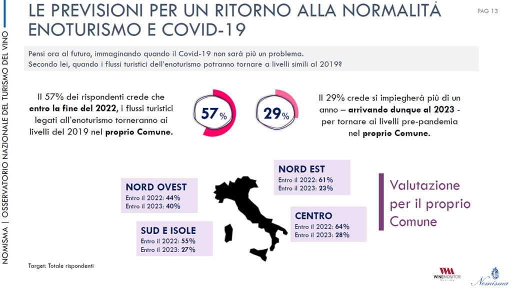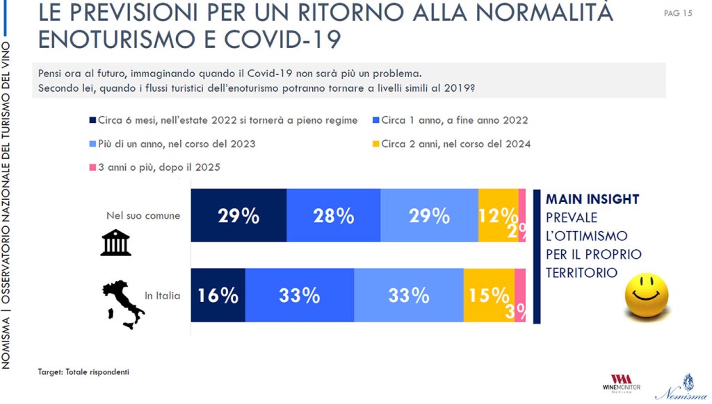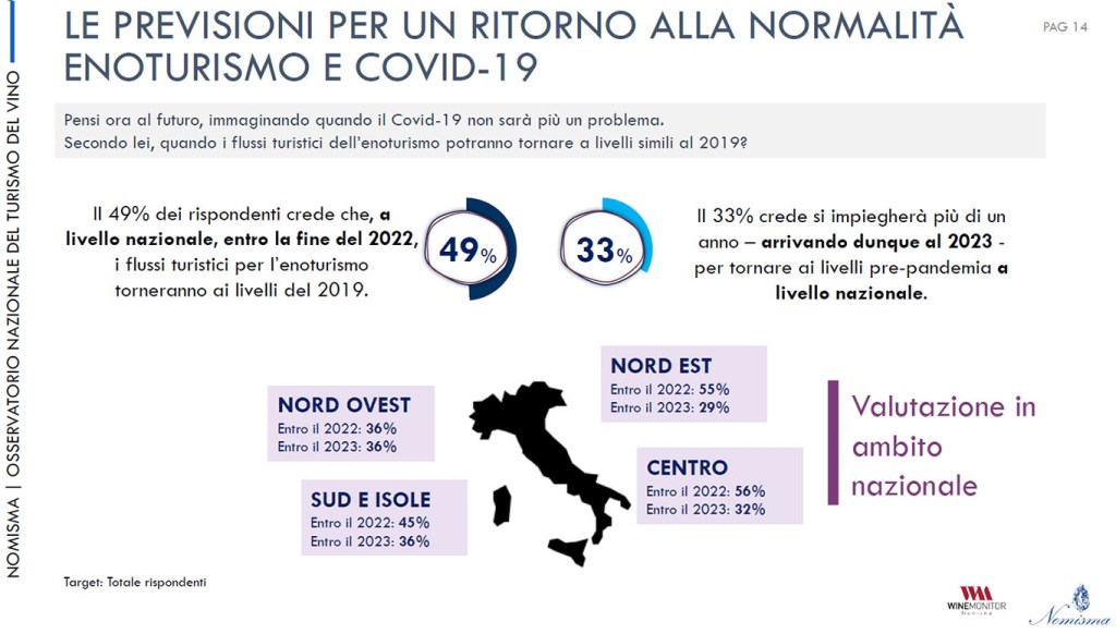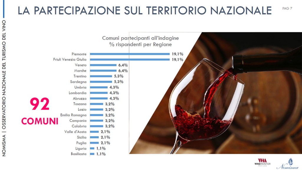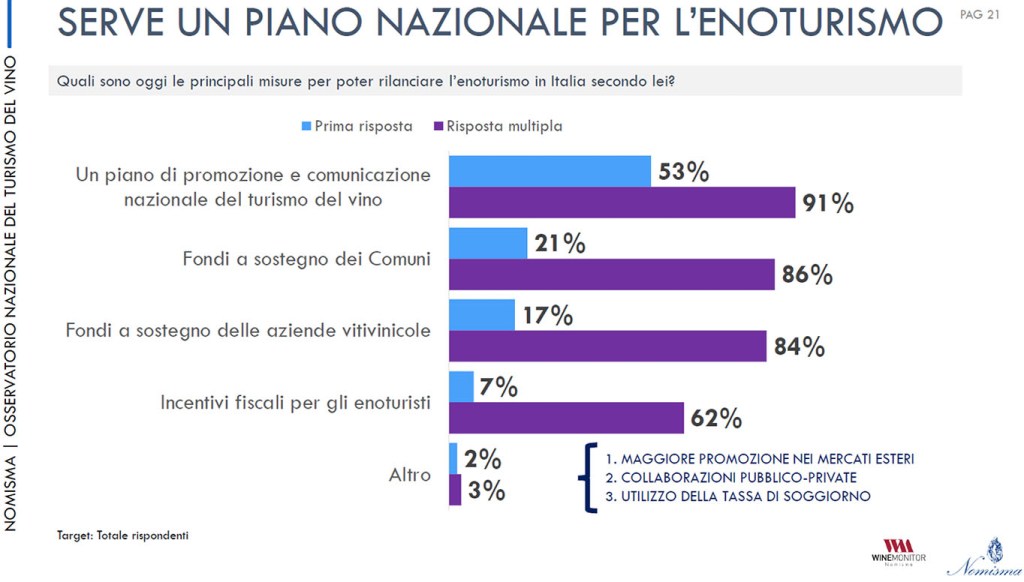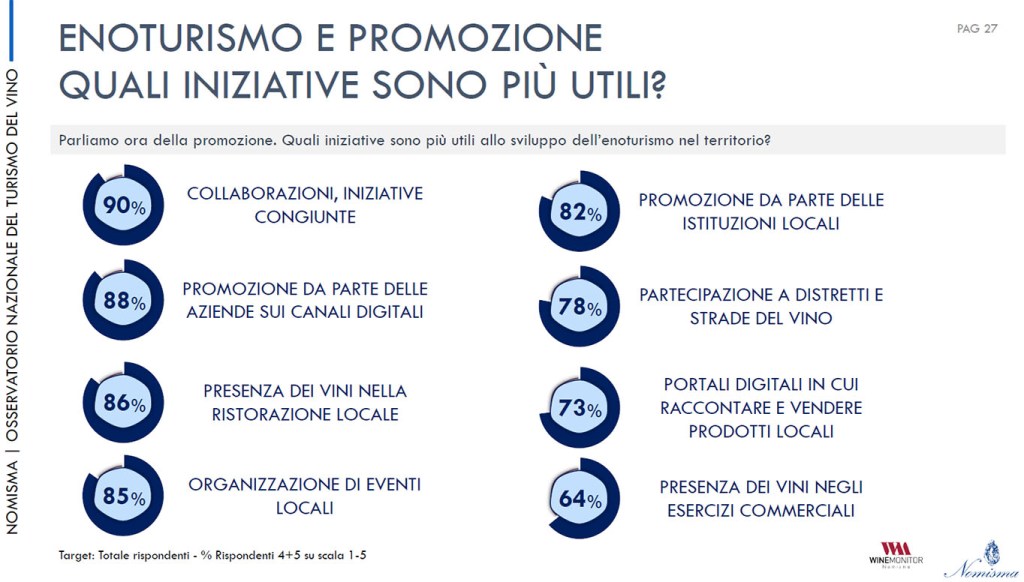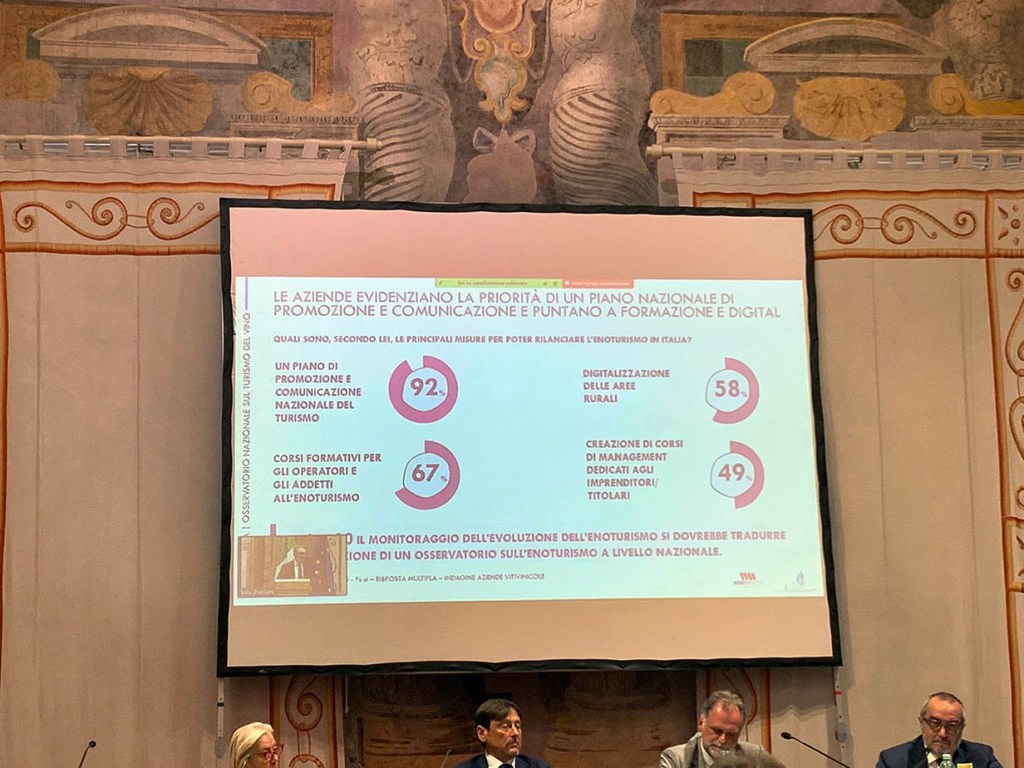 Lo studio è stato fatto analizzando 92 comuni e 150 cantine segnando così una sorta di record: è la prima indagine fatta su un numero così ampio di protagonisti nell’offerta enoturistica. Tutti chiedono alle istituzioni un piano di promozione e comunicazione nazionale sull’enoturismo che, per 6 aziende su 10, dovrebbe basarsi sui dati provenienti da un osservatorio permanente. Per il 67 per cento c’è bisogno di corsi di formazione rivolti agli addetti e per il 58 per cento è evidente l’esigenza della digitalizzazione delle aree rurali.