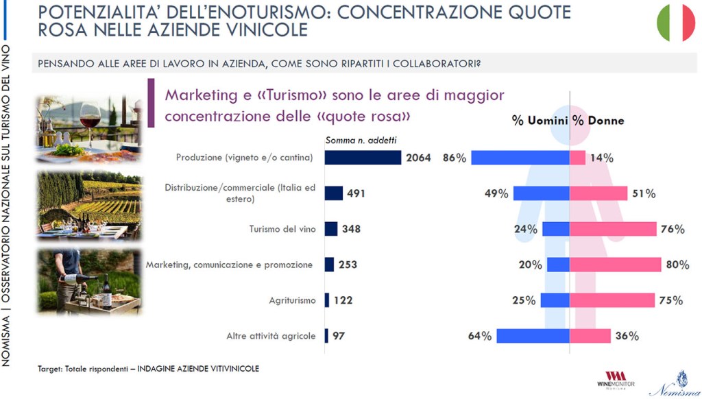 Donatella Cinelli Colombini, autrice della sezione dedicata alle buone pratiche enoturistiche post covid, ha sottolineato il carattere rivoluzionario dell’indagine che, per la prima volta, fotografa i ruoli nella filiera produttiva del vino secondo i generi: «Le donne sono il 14% di chi lavora in vigna e in cantina ma rappresentano la maggioranza degli addetti e dei manager nel marketing e comunicazione (80%) del commerciale (51%) e del turismo (76%). Come ha giustamente osservato Denis Pantini, gli uomini producono e le donne trasformano il vino italiano in euro».