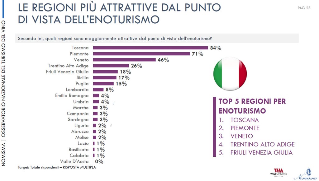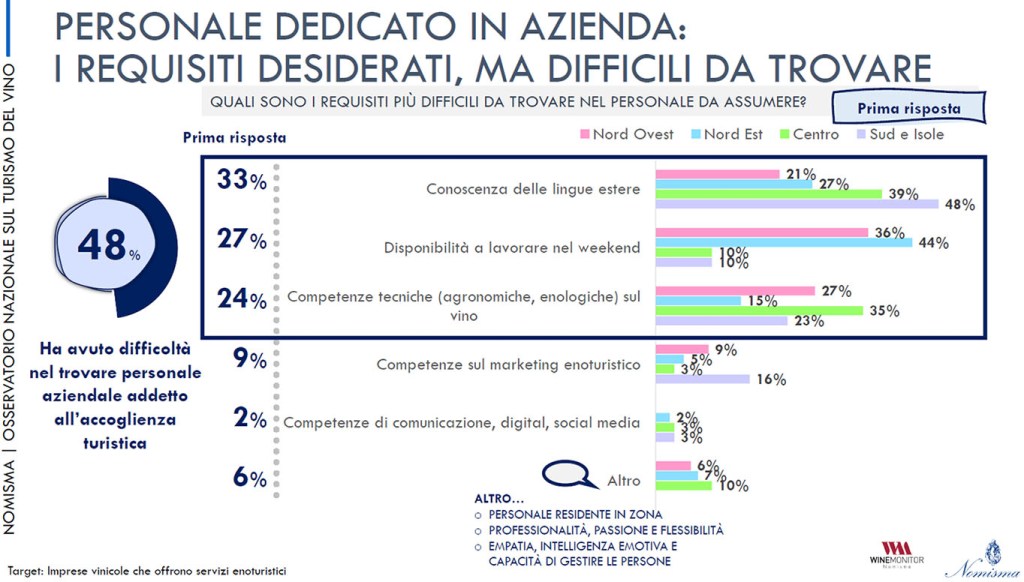 - PROVENIENZA, TARGET E EVOLUZIONE DELLE ESPERIENZE ENOICHE – La provenienza dei turisti è diversa a seconda delle zone d’Italia: nel Nord Ovest – Piemonte e Lombardia- prevalgono gli stranieri, le cantine del Nord Est ricevono soprattutto italiani come il Centro dove la maggioranza dei visitatori sono connazionali ma di altre regioni.