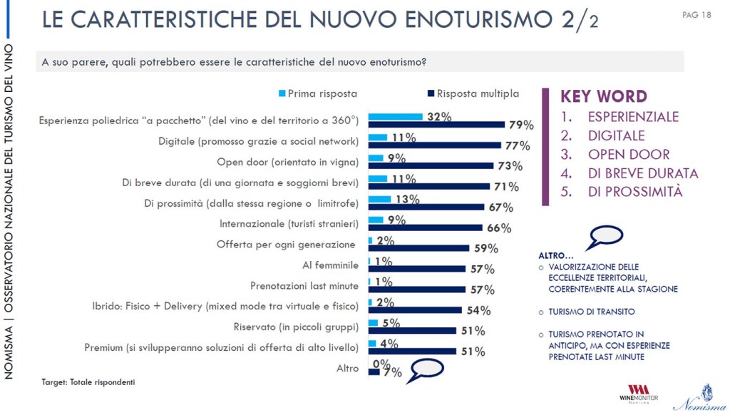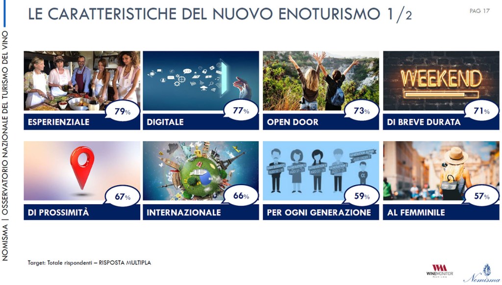 - I PUNTI DI FORZA DEL TURISMO DEL VINO ITALIANO – Per le cantine i punti di forza dell’offerta enoturistica italiana risiedono soprattutto nella moltitudine di vitigni autoctoni e denominazioni con caratteri distintivi, il paesaggio e i panorami, la gastronomia tipica, infine il contesto storico artistico che caratterizza i territori del vino.