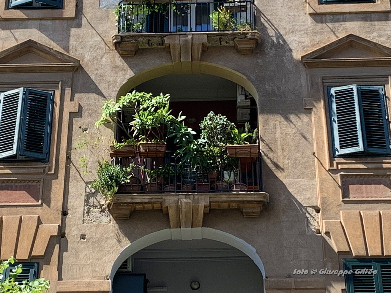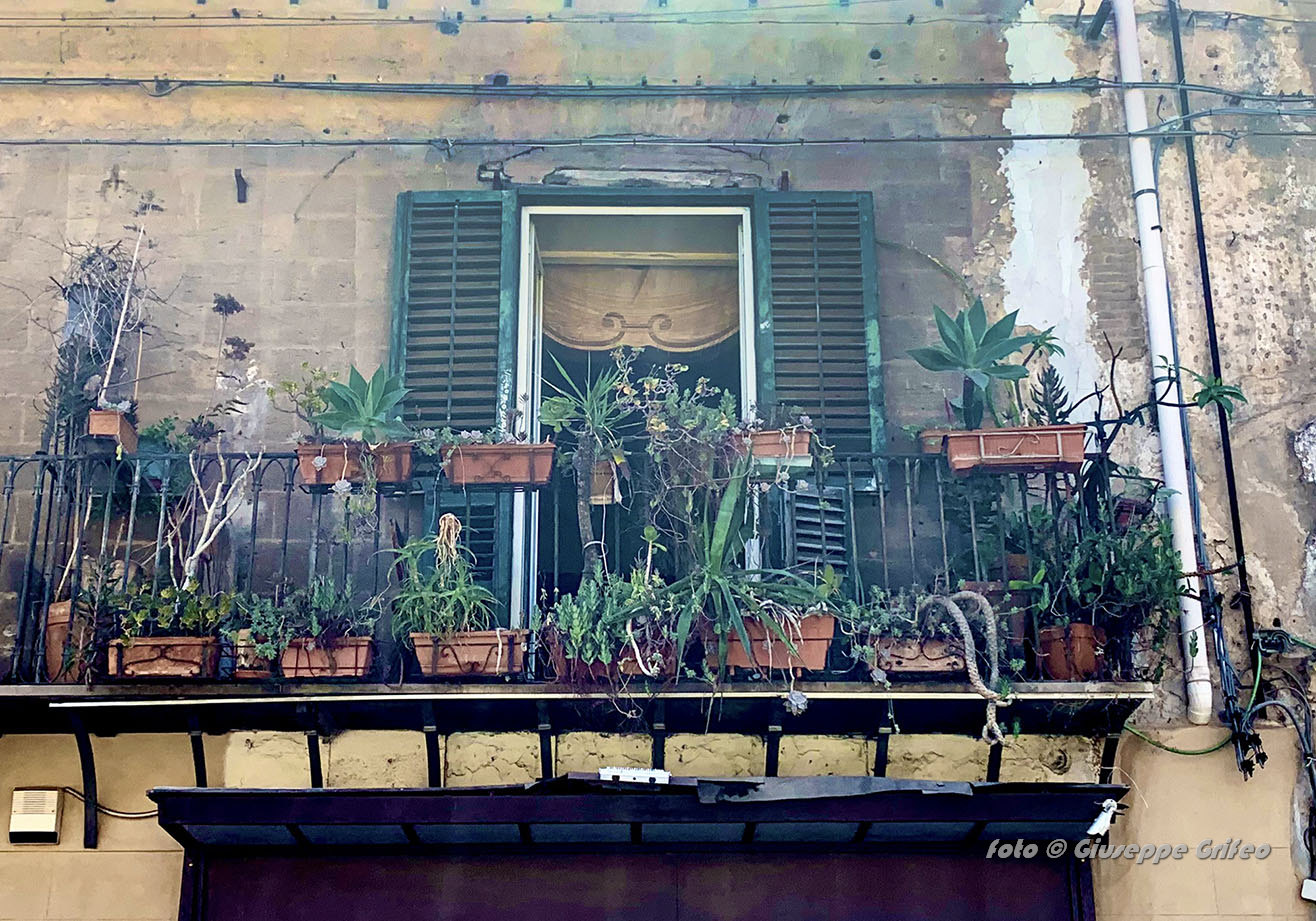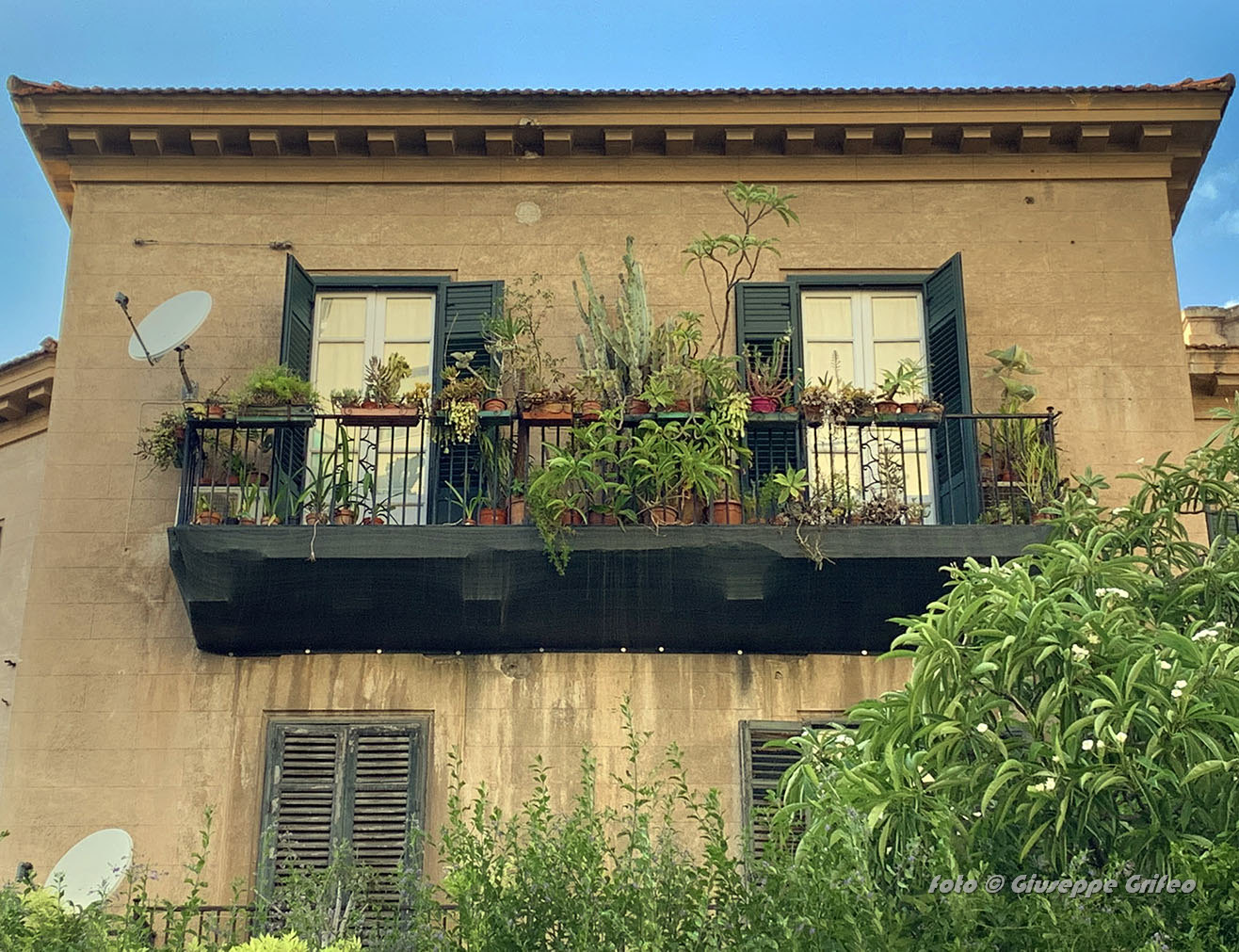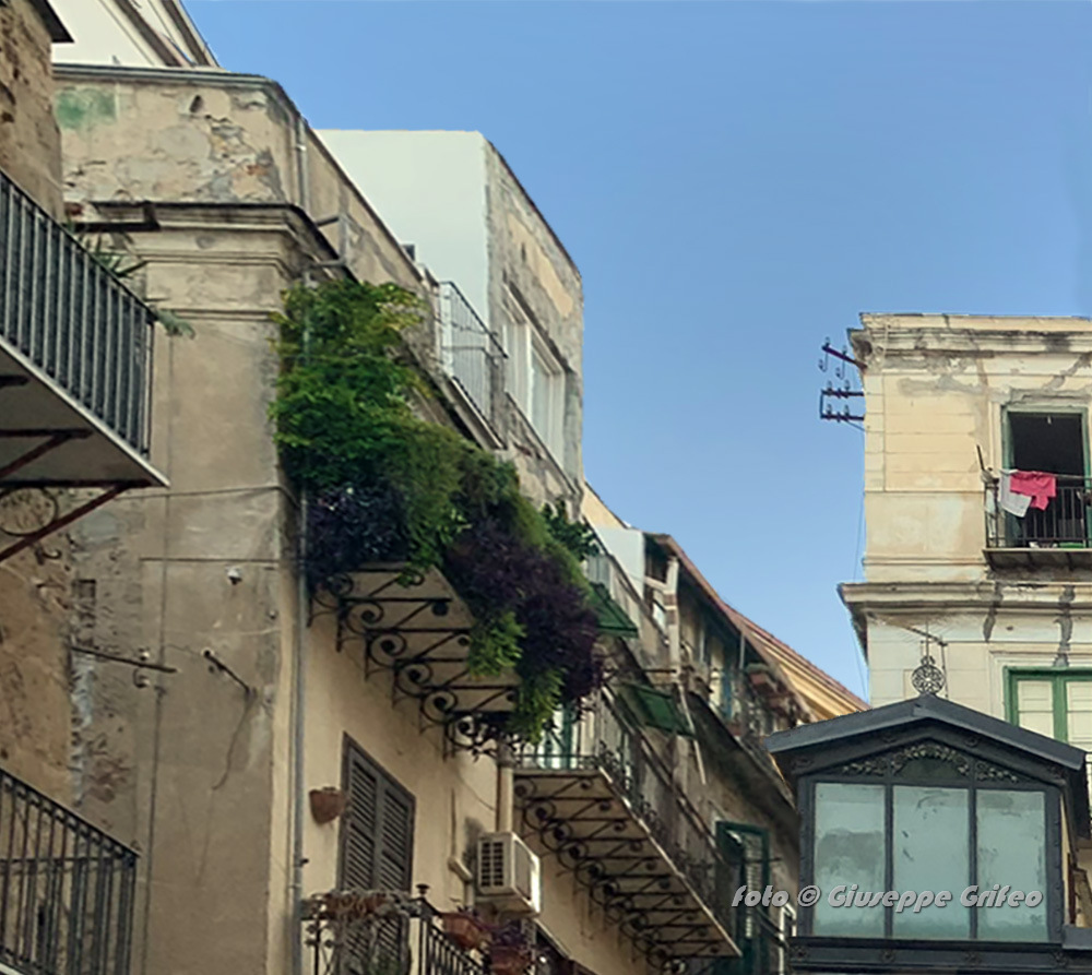 Le essenze che traboccano da quei balconi sono tutte siciliane o comunque piante che sopportano climi caldi, anche tropicali. Crescono rigogliose, prepotenti, si sviluppano a dismisura verso l’alto o tantissimo verso i piani inferiori. Cercano di appropriarsi anche delle pareti, in ogni direzione. Ben che vada, quando rimane spazio su quei piccoli terrazzini, la vivibilità, la superficie calpestabile, è ridotta a meno della metà.