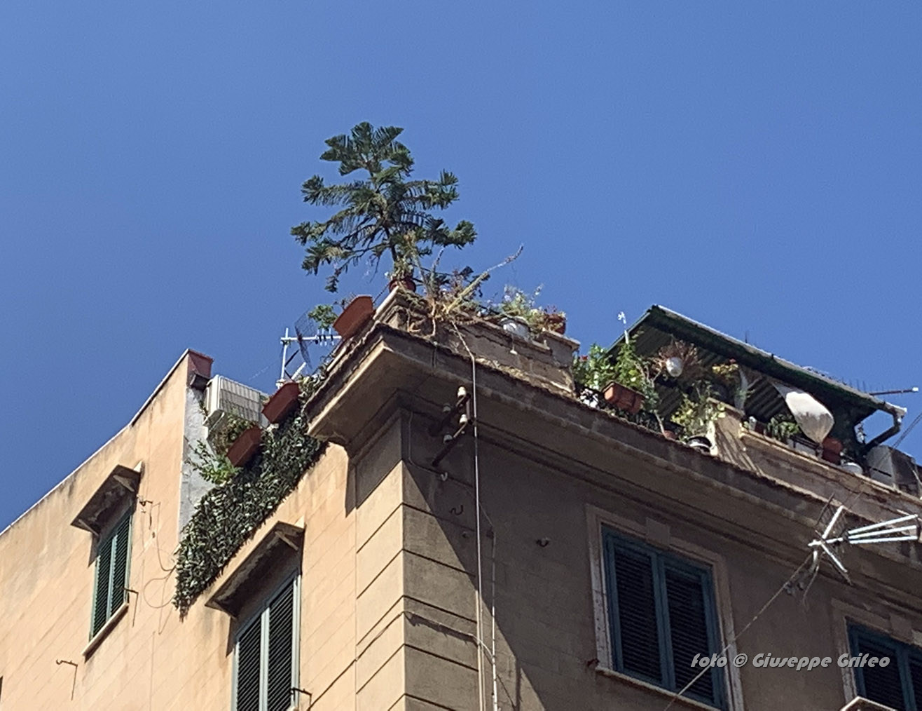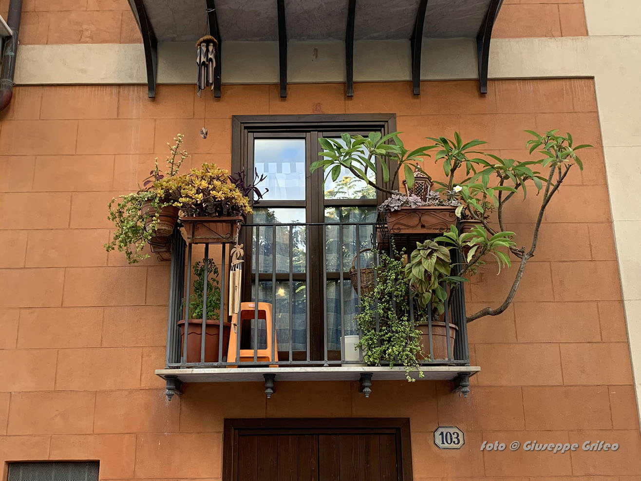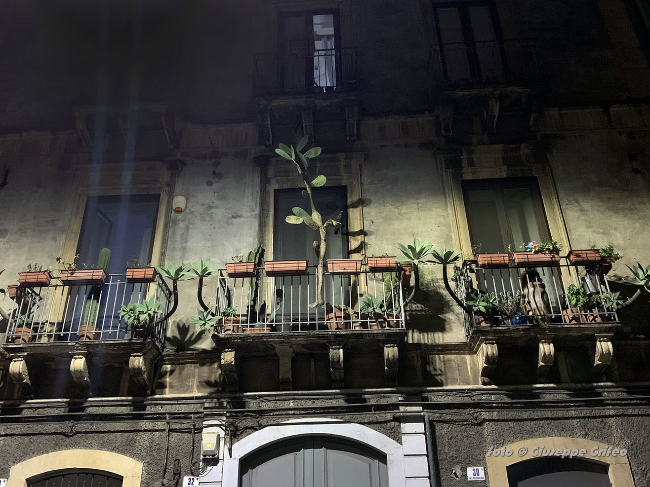 Le essenze che traboccano da quei balconi sono tutte siciliane o comunque piante che sopportano climi caldi, anche tropicali. Crescono rigogliose, prepotenti, si sviluppano a dismisura verso l’alto o tantissimo verso i piani inferiori. Cercano di appropriarsi anche delle pareti, in ogni direzione. Ben che vada, quando rimane spazio su quei piccoli terrazzini, la vivibilità, la superficie calpestabile, è ridotta a meno della metà.