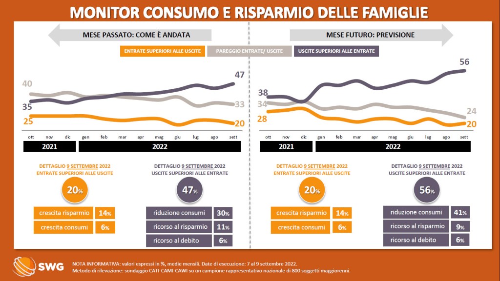 I dati di rilevamento dell’azienda-istituto che realizza ricerche di mercato, di opinione, istituzionali, studi di settore e osservatori, mettono nero su bianco una situazione economica in netto peggioramento. Monitoraggio SWG, consumo e risparmio delle famiglie: 56%, cresce la quota di coloro che potrebbero registrare uscite superiori alle entrate. Previsione per il prossimo mese.