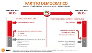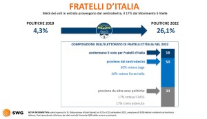 I votanti hanno scelto, che ci piaccia o no. Chiaramente visibile lo sbando dell’elettorato italiano, situazione che è resa evidente dagli astenuti, spesso persone che si crogiolano nella loro espressa protesta, basta leggere i loro messaggi social. Invece hanno solo dato spazio di esprimersi e di determinare un Parlamento ad altri. Né più né meno. Senza senso le proteste contro un governo di destra: è stato scelto democraticamente (lo affermo da persona che di certo non ha affinità con la destra, come non sopporto ogni estremismo). Comunque ecco tutta una serie di curiosità su come si è distribuito il voto alle scorse elezioni politiche nazionali e quali travasi tra partiti/movimenti grazie alle rilevazioni di SWG, ente di rilevamento di comprovata esperienza e di lunga tradizione.