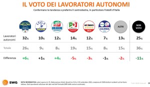 Gli operai, in crescita la fetta degli astensionisti e tra loro aumenta il consenso tra Movimento 5 Stelle, Lega e Forza Italia. I lavoratori autonomi hanno premiato Fratelli d’Italia e Forza Italia e sono stati più partecipi alle elezioni.