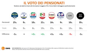 Per quanto riguarda i pensionati, questi tendono a preferire le formazioni politiche più grandi, maggiormente attraenti per loro sia PD che Forza Italia. L’astensione è diminuita di un punto percentuale.