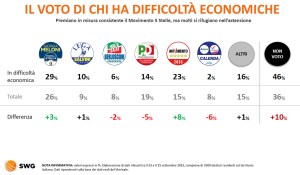 Tragicamente più astensionisti (+10%) coloro che sono in difficoltà economiche, segno di una grande perdita di fiducia nel sistema. Coloro che sono andati a votare il 25 settembre 2022 hanno favorito in misura consistente il Movimento 5 Stelle (+8%) e in misura sensibilmente minore Fratelli d’Italia (+3%). Forte calo – in ordine di performance negativa decrescente – per Azione-Italia Viva, PD e Forza Italia.