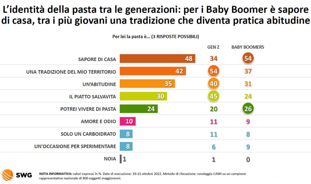E la Generazione Z come si è espressa? La pasta è vista come tradizione del territorio (neppure si parlasse di archeologia), come un’abitudine (quindi, pasta=noia, senza emozioni?.. questa risposta mi far sentire male), anche se un 45% la considera un piatto salvavita.