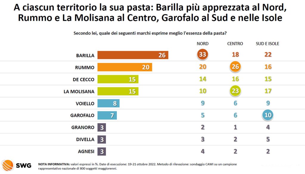 La differenza nel gradimento la fa anche la latitudine di nascita e di residenza. Tanto per capirsi, il sondaggio SWG ha messo in evidenza come Barilla sia la pasta del Nord d’Italia, lì la apprezzano un terzo dei settentrionali, poi Rummo e La Molisana, marchi molto preferiti al Centro. A seguire Garofalo e, un punto percentuale sotto, anche Voiello che sono marchi più apprezzati al Sud e nelle isole, meno altrove.