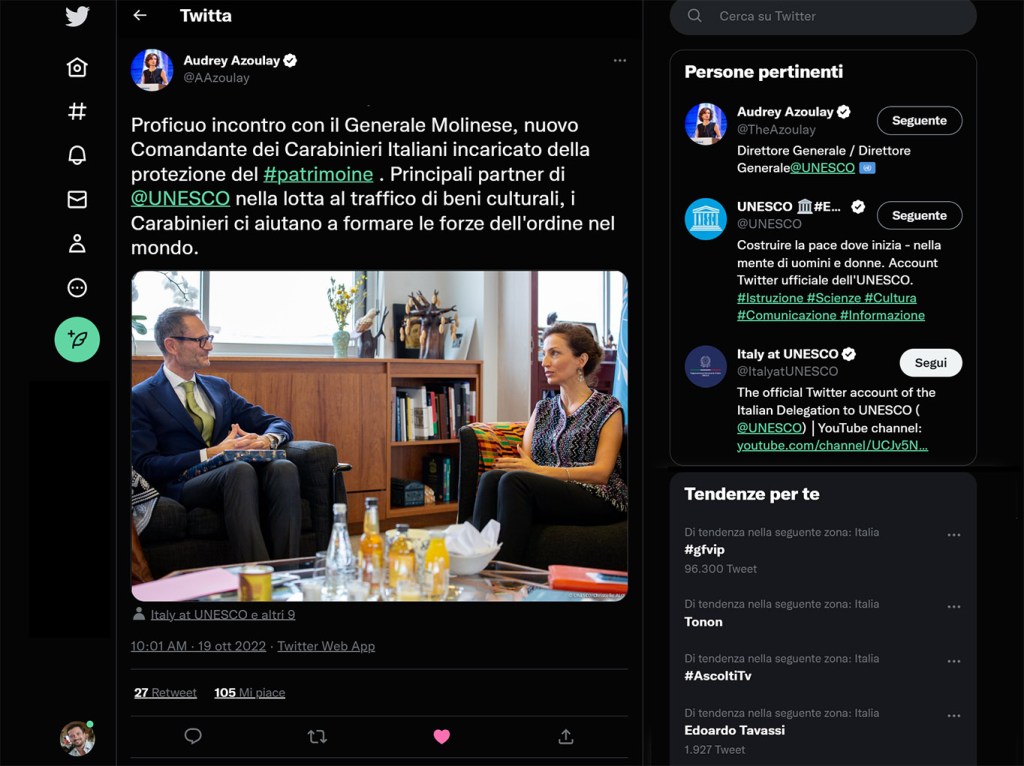 Successivamente, a Parigi, il 19 ottobre 2022, un confronto diretto con i vertici Unesco: il Generale Molinese ha incontrato Audrey Azoulay, direttrice generale dell’Organizzazione delle Nazioni Unite per l’Educazione, la Scienza e la Cultura.