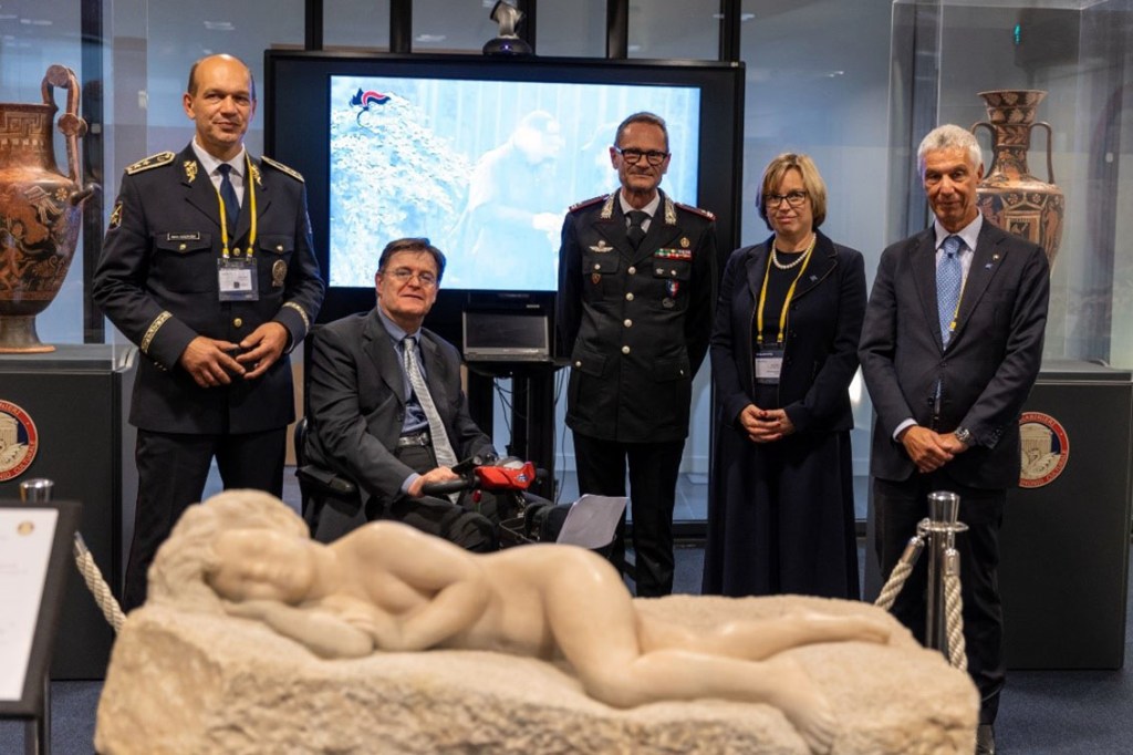 “Il saccheggio delle aree di interesse archeologico, il furto delle opere d’arte, la contraffazione e l’esportazione dei beni culturali sono soltanto alcuni degli illeciti commessi dalla criminalità internazionale. Nella prestigiosa sede di Europol il Comando TPC ha presentato alcuni recuperi frutto di complesse operazioni investigative condotte in collaborazione con le Forze di polizia degli Stati interessati. Tra le opere in mostra, un elmo corinzio in bronzo risalente al 500 a.C. trafugato in data imprecisata in un’area compresa tra le regioni italiane di Puglia e Basilicata e recuperato in Belgio nel 2020; la scultura marmorea Sogno di bimba realizzata da Arturo Dazzi nel 1926, trafugata nel 2006 da una cappella privata di Roma, rimpatriata nel 2021 dopo essere stata recuperata in Francia; uno stamnos etrusco in bronzo risalente al 400-350 a.C., illecitamente scavato in Italia meridionale e recuperato a Londra nel 2019”.