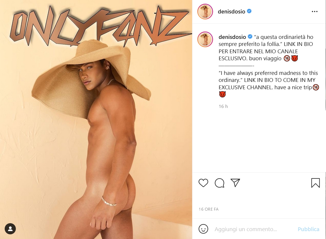 Tra i personaggi che hanno aperto un loro spazio Onlyfans ce n’è uno, Denis Dosio, che in varie interviste (blogtivvu.com) minimizza i tanti denari guadagnati grazie a questo suo spazio online. Sottolinea che è attratto da altro, “… l’immaginazione è la cosa più dispersiva e assurda della nostra mente, vado fuori di testa nel giocarci con i miei follower, e loro altrettanto! Sc*pare il cervello di chi mi segue, quello sì“.