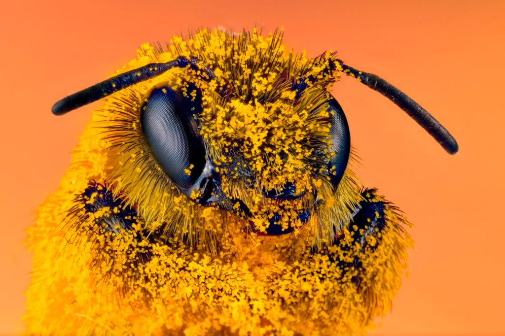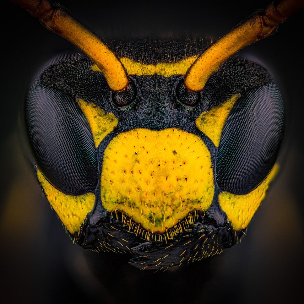 Nell’ordine, da sinistra a destra e dall’alto in basso, un’Ape mineraria ricoperta di polline, la caleidoscopica e metallicamente coloratissima Vespa dorata (Cuckoo wasp-Chrysididae, famiglia di imenotteri apocriti), a seguire una Formica rufa o formica rossa, poi l’ingrandimento di un occhio composito di Apis mellifera o ape europea/ape occidentale. E ancora, testa e occhi compositi di una Vespa Crabro, classico calabrone detto pure Aponale o Cravunaro rosso, il più grande d’Europa. Poi un’Andrena vaga, ape mineraria dal dorso grigio. A tutto questo segue una Hymenoptera Chrysididae-Chrysis sp. angustula – Auksavapsvė e infine testa e occhi compositi di Polistes dominula, imenottero della famiglia Vespidae, diffuso in Europa e in Nord Africa.