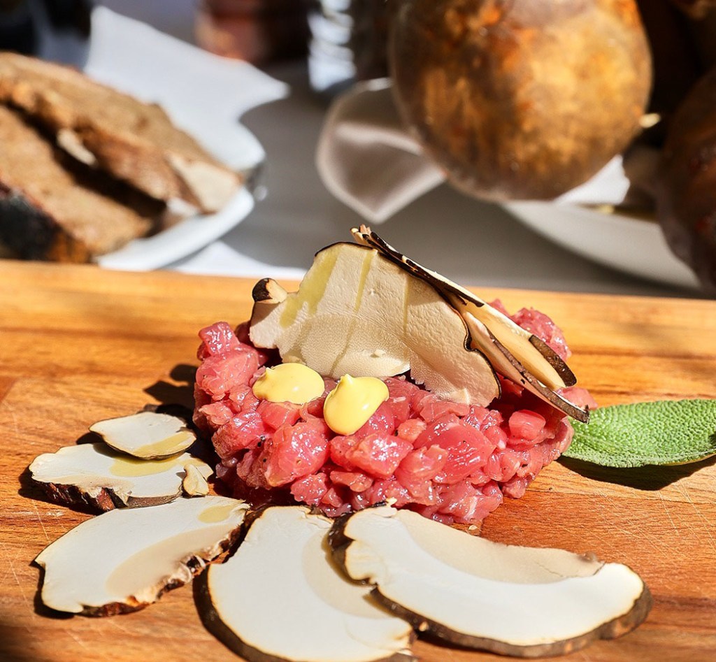 Tortino di patate e salsiccia con crema di broccolo romanesco, gli indimenticabili tonnarelli cacio e pepe, stinco al forno con patate, coniglio ripieno con fonduta al tartufo, fettuccine ai funghi porcini di stagione e una visione particolare, la Carbonara al tartufo. Poi ci sono la fantasia e l’innovazione che nel segno della tradizione e della materia prima locale, mettono in campo pietanze con nuove declinazioni di gusto: Battuta di filetto con sfoglia di porcino crudo; Tartare Special con base di riso soffiato, mayo aromatizzata al limone, mandorle tostate e croccante di parmigiano; Galletto alla brace in doppia cottura; funghi fritti; le Pizzacce, nuvole di soffice piacere farcita con gli ingredienti più saporiti della stagione.