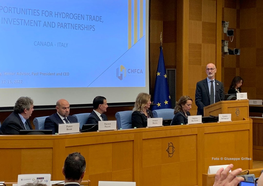 Poi, Paolo Quattrocchi, presidente Centro Studi Italia-Canada, Barbara De Donno, segretario generale ICC, International Chamber of Commerce Italia, Armando Melone, capo del team politico della Rappresentanza della Commissione UE in Italia, Gianni Lattanzio, presidente Confassociazioni International, Alberto Cirio, presidente della Regione Piemonte, Paolo Righi, presidente Confassociazioni Real Estate, Mark Kirby, senior advisor Canadian Hydrogen and Fuel Cell Association, Raphael Lance, head of Energy Transition Funds di MIROVA – NATIXIS IM, Hannelore Rocchio, head of Energy Evolution Integrated Initiatives & Regulatory Activity di ENI, Carlo Zorzoli, head of Business Development di ENEL Green Power, Domenico Maggi, head di SNAM International and European Affairs, Francesco Lepre, capo della Divisione Energy Management & Trading di DUFERCO Energia, Elena Lorenzini, vicecapo di Gabinetto del ministero delle Imprese e del Made in Italy, Roberto Menotti, direttore Aspenia online, Oscar Di Montigny, top manager ed esperto di Mega Trends.