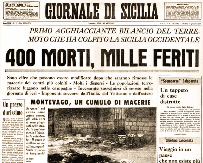 Bastano pochi attimi e quello che sembra eterno, usuale, quotidiano, normale, viene totalmente sconvolto. Case, edifici storici, strade, tutto crolla. Vite, esistenze spezzate, famiglie monche dei loro affetti, amputate, ferite se non dissolte. Il terremoto del Belìce dal 14 al 25 gennaio del 1968 colpì duramente una vasta area della Sicilia occidentale. Interi borghi e paesi furono letteralmente cancellati: Gibellina, Salaparuta, Poggioreale e Montevago. Dopo questo preambolo rievocativo e due immagini, ho inserito il collegamento all’articolo completo.
