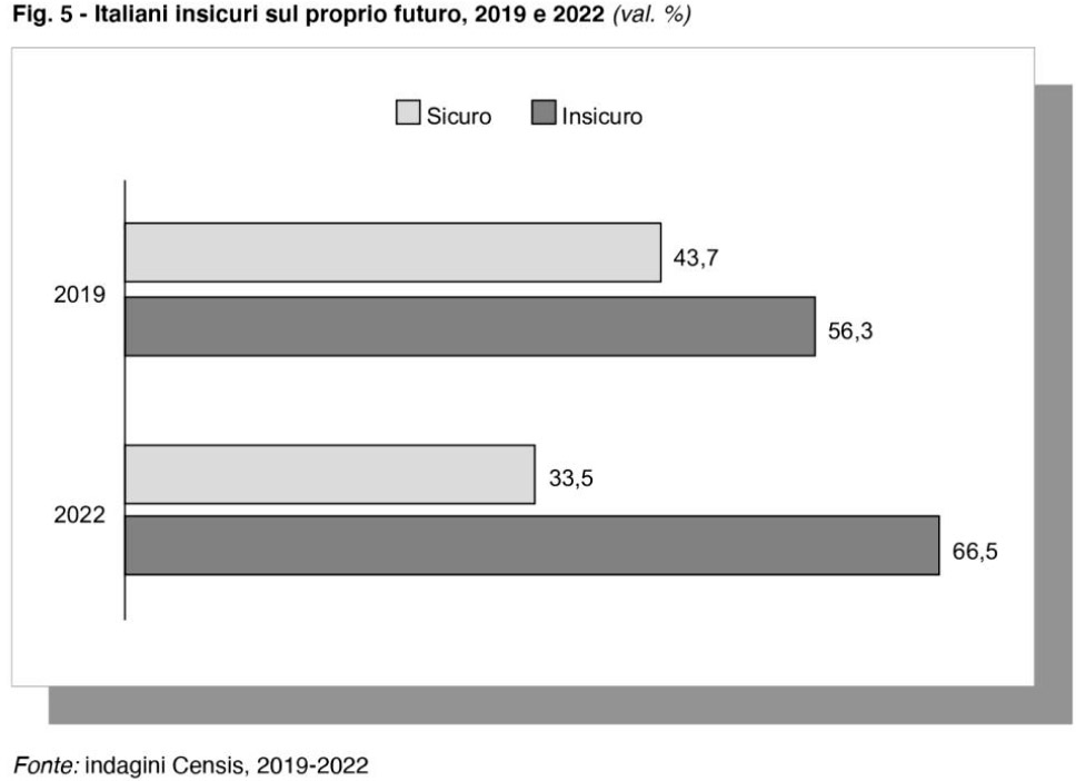 Così, il 66,5% degli italiani (oltre 10 punti percentuali in più rispetto al 2019 pre-Covid), dopo gli eventi che hanno stravolto il quotidiano, si sente insicuro pensando al futuro proprio e della propria famiglia: due italiani su tre sono pervasi dall’insicurezza.