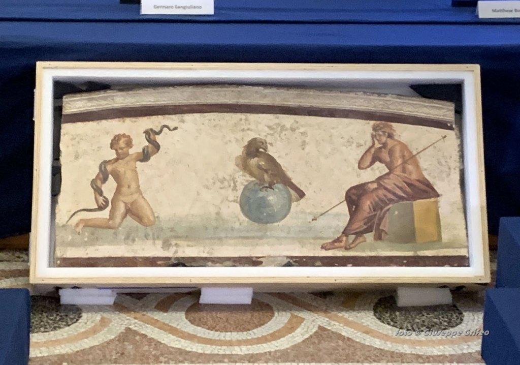 Tra gli oggetti appena presentati al ministero della Cultura, trafugati e messi in vendita sul mercato illecito, anche un affresco dell’area di Ercolano o Pompei raffigurante Ercole fanciullo con serpente del I secolo dopo Cristo.