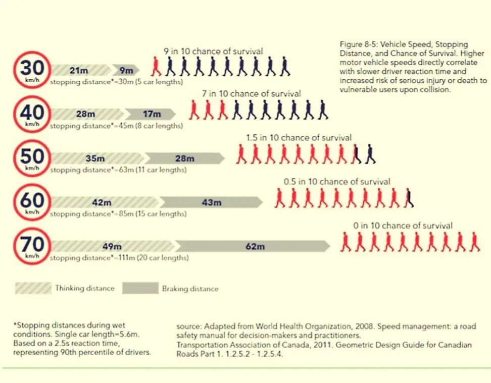Questo non-pensiero è stato accompagnato da un’immagine a “effetto scientifico” (qui di seguito), grafica che, oltretutto, evidenzia la grande convenienza/vantaggio ottenuto solo nel passaggio da 50 a 40 chilometri all’ora. Immaginatevi però in città sterminate come Roma a percorrere le tangenziali cittadine e i lunghi, grandi viali alla velocità di 30 chilometri all’ora. E le merci nei supermercati e centri commerciali come le portiamo? Fin dove dovrebbero arrivare i tir? Nodi di scambio esterni e dove, come? E gli altrettanto grandi mega bus turistici possono circolare in presunte città adatte – oggi – a cavalli e carrozze?