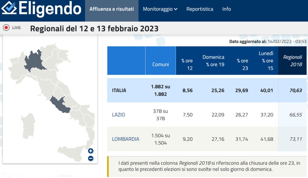 Quindi urne delle sezioni elettorali quasi per nulla frequentate dai cittadini. Per essere più precisi, rispetto alle precedenti votazioni regionali la partecipazione nel Lazio si è più che dimezzata, in Lombardia si è ridotta di circa il 45 per cento.
