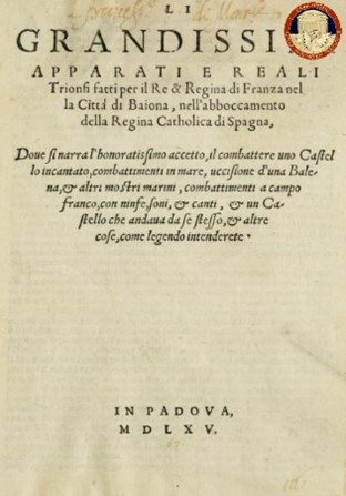 “Li grandissimi apparati e reali trionfi fatti per il re & regina di Franza nel la città di Baiona, nell’abboccamento della regina catholica di Spagna Li grandissimi apparati e reali trionfi fatti per il re & regina di Franza nel la città di Baiona, nell’abboccamento della regina catholica di Spagna doue si narra l’honoratissimo accetto, il combattere uno castello incantato, combattimenti in mare, uccisione d’una balena & altri mostri marini, combattimenti a campo franco, con ninfe, soni & canti, & un castello che andaua da se stesso, & altre cose, come legendo intenderete. In Padova, 1565”;