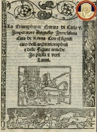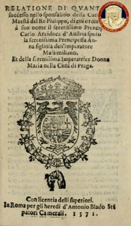 “Relatione di qvanto e successo nello sponsalitio della Catholica Maestà del re Philippo, di cui ordine, & à Suo nome il serenissimo prencipe Carlo arciduca d’Austria sposo la serenissima prencipessa Anna figliola dell ‘imperatore Massimiliano, e della serenissima imperatrice donna Maria nella città di Praga”, la cui coperta, le miniature e le illustrazioni calcografiche sono di notevole fattura.