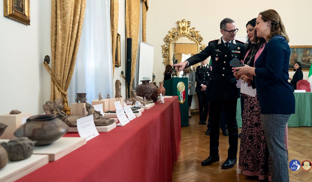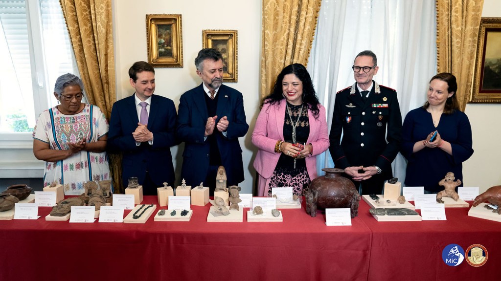 Il 24 marzo 2023 i quarantatré preziosi oggetti sono stati restituiti nei saloni dell’Ambasciata del Messico in Italia. Presenti Alejandra Frausto, ministro della Cultura messicana, Carlos Garcia di Alba, Ambasciatore del Messico in Italia e il Generale di Brigata Vincenzo Molinese, Comandante dei Carabinieri Tutela Patrimonio Culturale.
