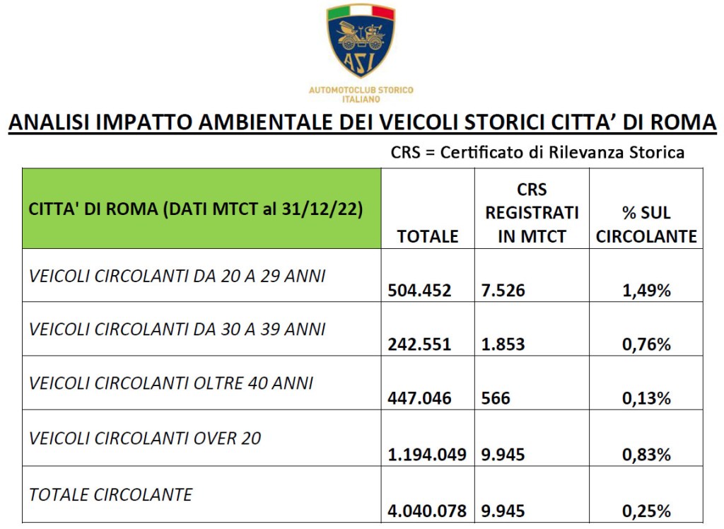 I mezzi storici e da collezionismo a Roma – gli unici che possono essere qualificati come tali secondo i termini di legge sono certificati di interesse storico da enti stabiliti dalla Norma e registrati presso la Motorizzazione – sono pochissimi: oggi corrispondono allo 0,25% del parco veicolare circolante a Roma.