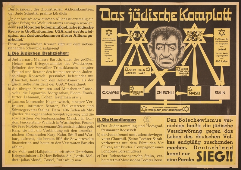 Per rimanere in tema riprendo un esempio di complottismo che funzionò molto bene e fu tragico. Il regime nazista lo ideò trascinando un popolo verso l’annientamento di un altro (dramma reale e non immaginifico come credono alcuni italiani idioti). Vi metto qui in basso un esempio tra i tantissimi diffusi all’epoca:
