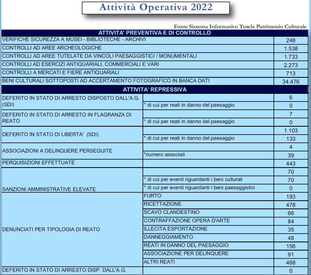 L’attività operativa evidenzia nel 2022 una graduale diminuzione dei reati contro il patrimonio culturale, anche alla luce delle innovazioni legislative che hanno inasprito il sistema sanzionatorio, rendendo più efficace l’attività repressiva. La Legge n. 22 del 22 marzo 2022 ha, di fatto, modificato le disposizioni penali in materia di tutela del patrimonio culturale, attualmente contenute prevalentemente nel Codice dei Beni Culturali (D.lgs. 42/2004), integrando il Codice Penale con 17 nuovi articoli (da 518-bis a 518-undevicies), prevedendo anche la possibilità per gli ufficiali di polizia giudiziaria dell’Arma, specializzati nel settore dei beni culturali, di svolgere attività sotto copertura per contrastare il traffico illecito di opere d’arte.