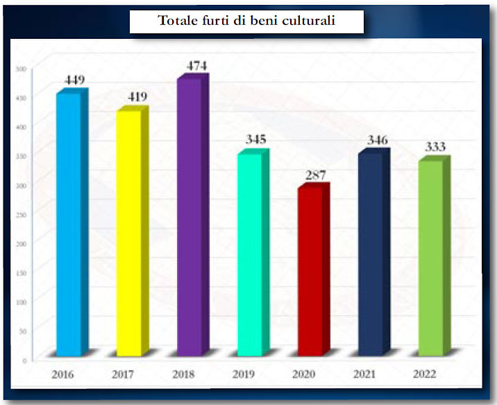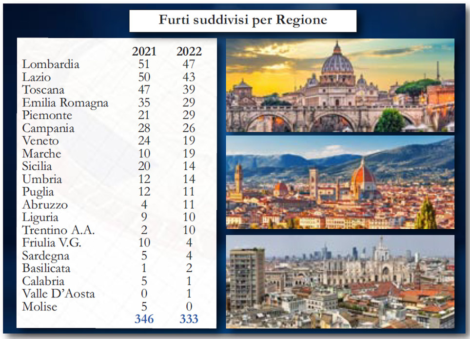 Rispetto al 2021 i dati mettono in evidenza una lieve flessione dei furti di beni culturali (-3,7%).