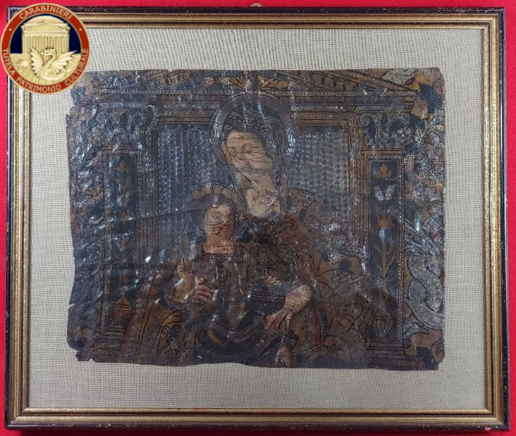 - 1 dipinto su cuoio del tipo “Paliotto” raffigurante una Madonna con bambino di Bottega Veneta del XVII secolo sottratto a un ente religioso.
