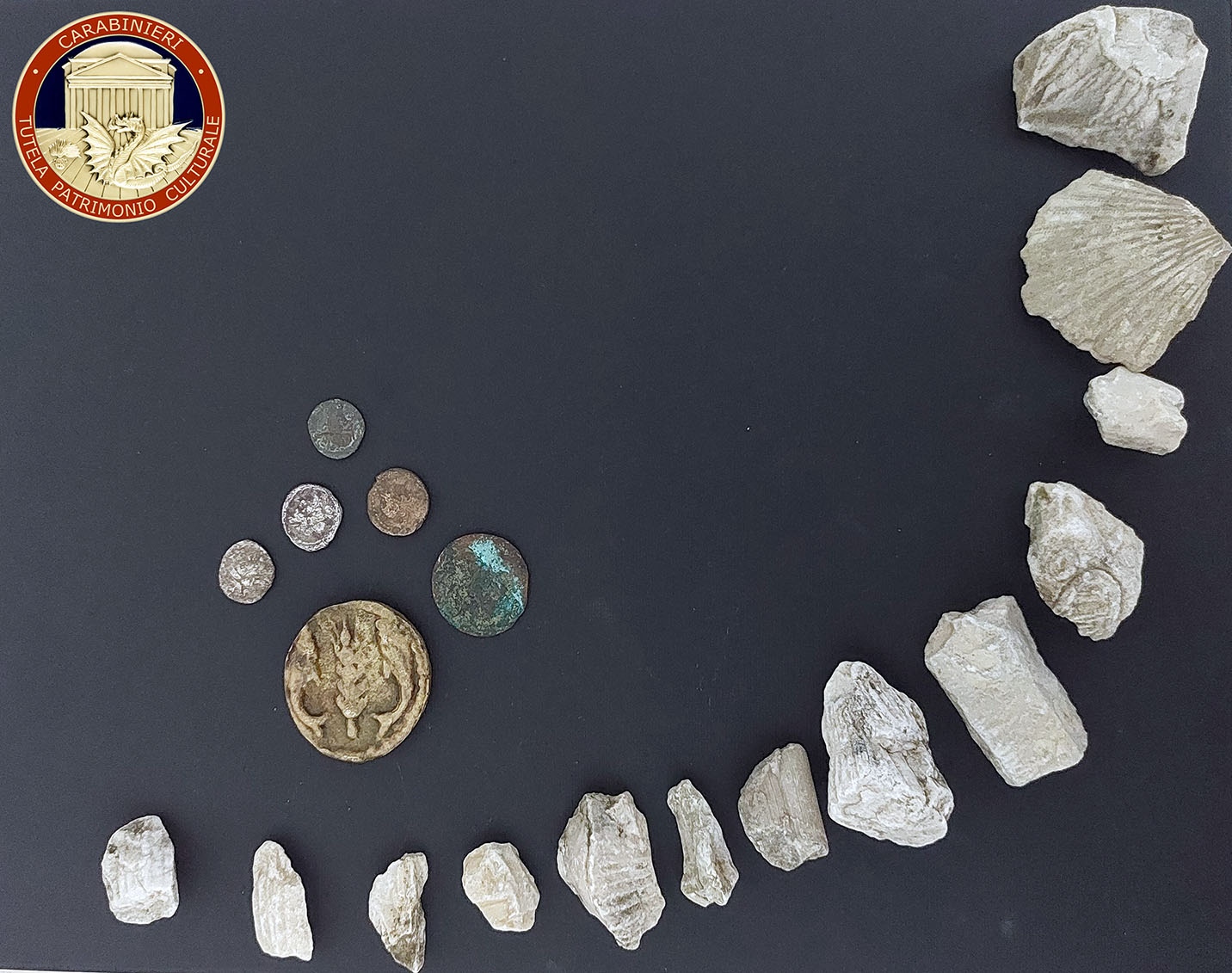 - 6 monete di natura archeologica risalenti al III – I secolo a.C., 13 fossili di natura paleontologica e 1 metal detector professionale.