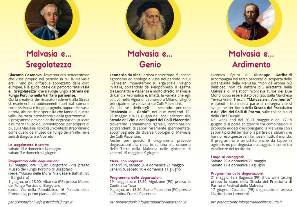 Primo appuntamento con “Malvasia e Sregolatezza” in programma dal 13 al 14 maggio in Val di Taro, sulla Strada del Fungo Porcino, con un testimonial d’eccezione, Giacomo Casanova che visse proprio nel periodo in cui la Malvasia era il vino più diffuso e apprezzato dalle corti europee: il personaggio accompagnerà idealmente lungo il percorso della Strada del Fungo Porcino.