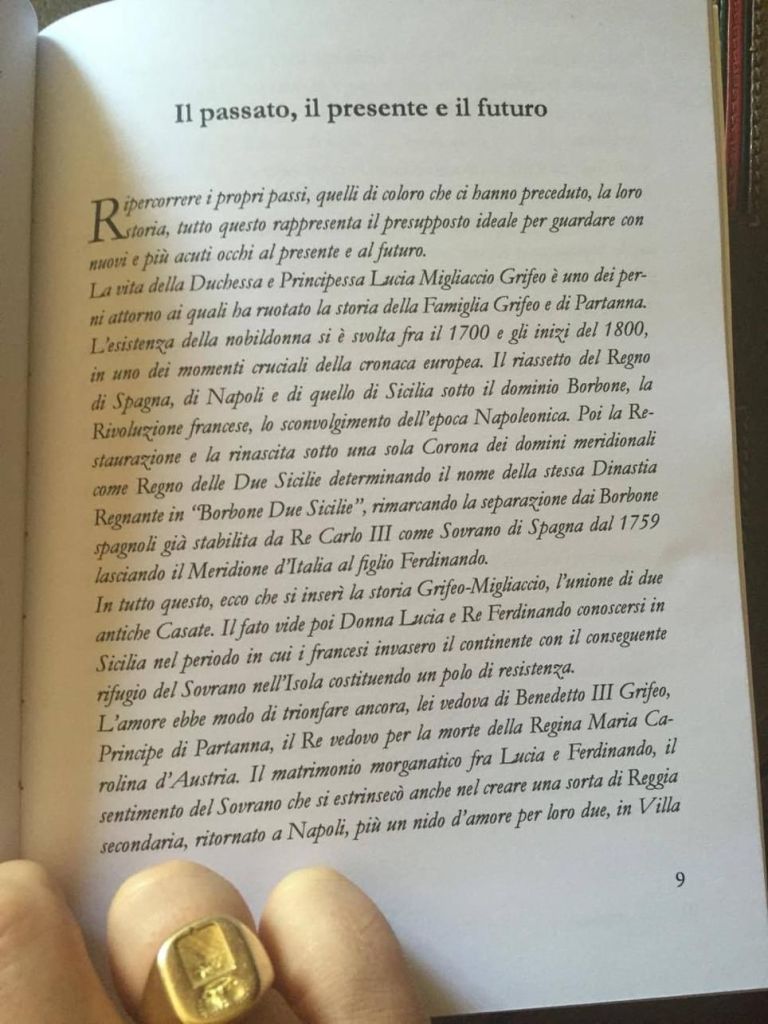 Il volume fu presentato il 10 giugno 2016 a Castello Grifeo (Comune di Partanna – provincia di Trapani) per l’inaugurazione della mostra su Lucia Migliaccio, duchessa di Floridia, principessa di Partanna e moglie morganatica di Re Ferdinando IV di Borbone. Alla mostra fu esposto l’abito da sposa della Principessa, due dipinti a olio su tela di cui una rappresenta la stessa nobildonna, oltre alle dalmatiche ricavate da un vestito che Lucia regalò nell’Ottocento alla Chiesa Madre della cittadina di Floridia (Siracusa). Alla mostra era presente anche un dipinto che raffigurava Benvenuto I Grifeo vissuto nel XIV secolo.