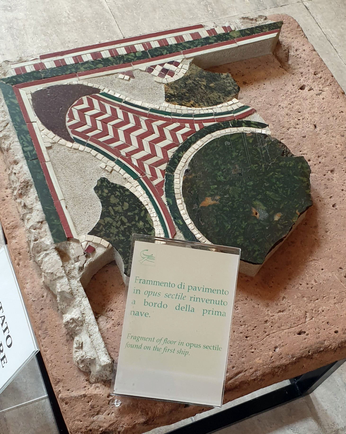 Qui sopra, immagini del Museo delle navi romane a Nemi. Il mosaico perduto proveniente dalle navi di Caligola, esportato illegalmente in America nel dopoguerra e restituito all’Italia grazie all’azione dei Carabinieri TPC-Comando Tutela Patrimonio Culturale, è tornato al Museo delle Navi Romane di Nemi l’11 marzo 2021 – foto Angelo Campus