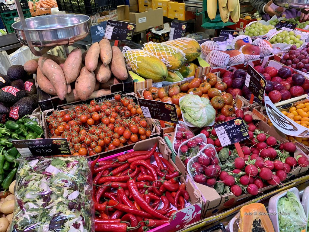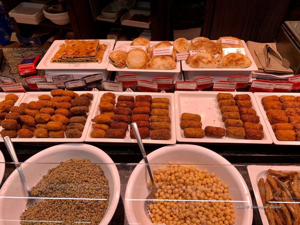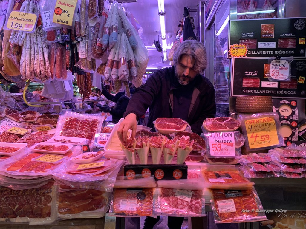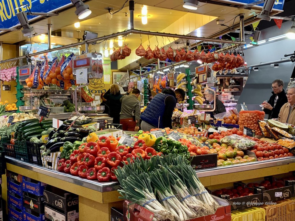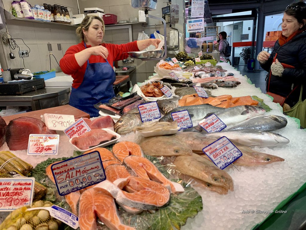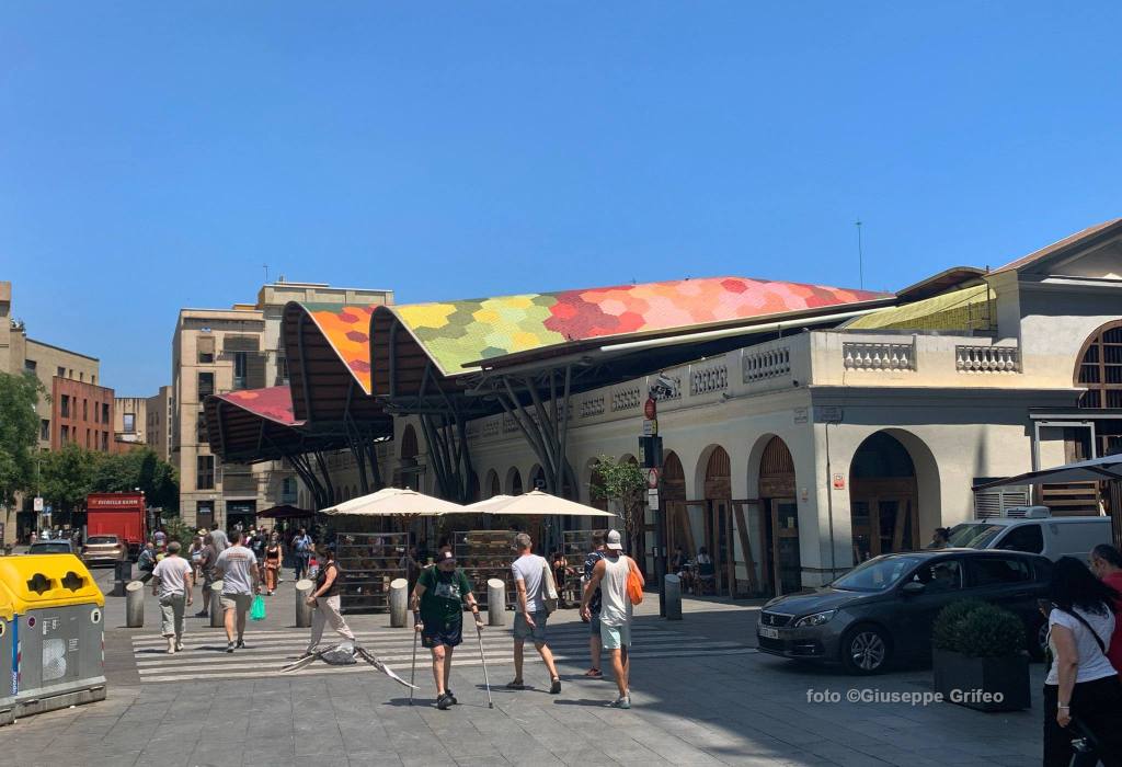 Anche l’interno è un trionfo di colori per i prodotti esposti, un punto nevralgico per primizie, per il pesce appena pescato, carni di ogni tipo, frutta, verdure, ortaggi freschi, pane, dolci, tipicità catalane a iniziare dagli insaccati e dai formaggi. Di sicuro è un mercato meno turistico, meno noto, quindi meno affollato. Per questo motivo più esplorabile/gustabile rispetto alla più nota Boqueria sulla Rambla.