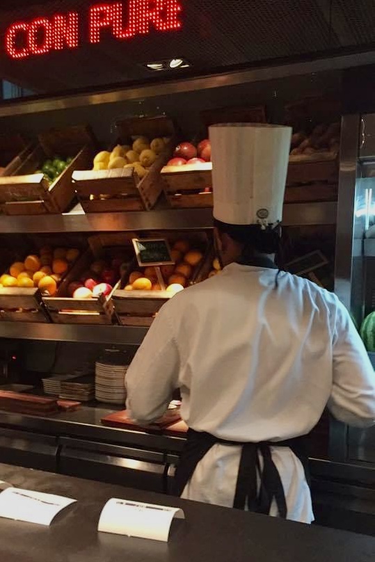 Curiosando con lo sguardo verso la cucina è bello vedere gli ingredienti, i loro colori, la loro scelta da parte da chi sta ai fornelli, il dosaggio-preparazione di ogni alimento, le pentole che sobbollono, le padelle manovrate sulle fiamme, la composizione dei piatti, l’accuratezza di Antonio Rodriguez che tutto assaggia, che controlla l’impiattamento per una pulizia grafico-visiva che nutra l’occhio: ai suoi occhi nulla sfugge.