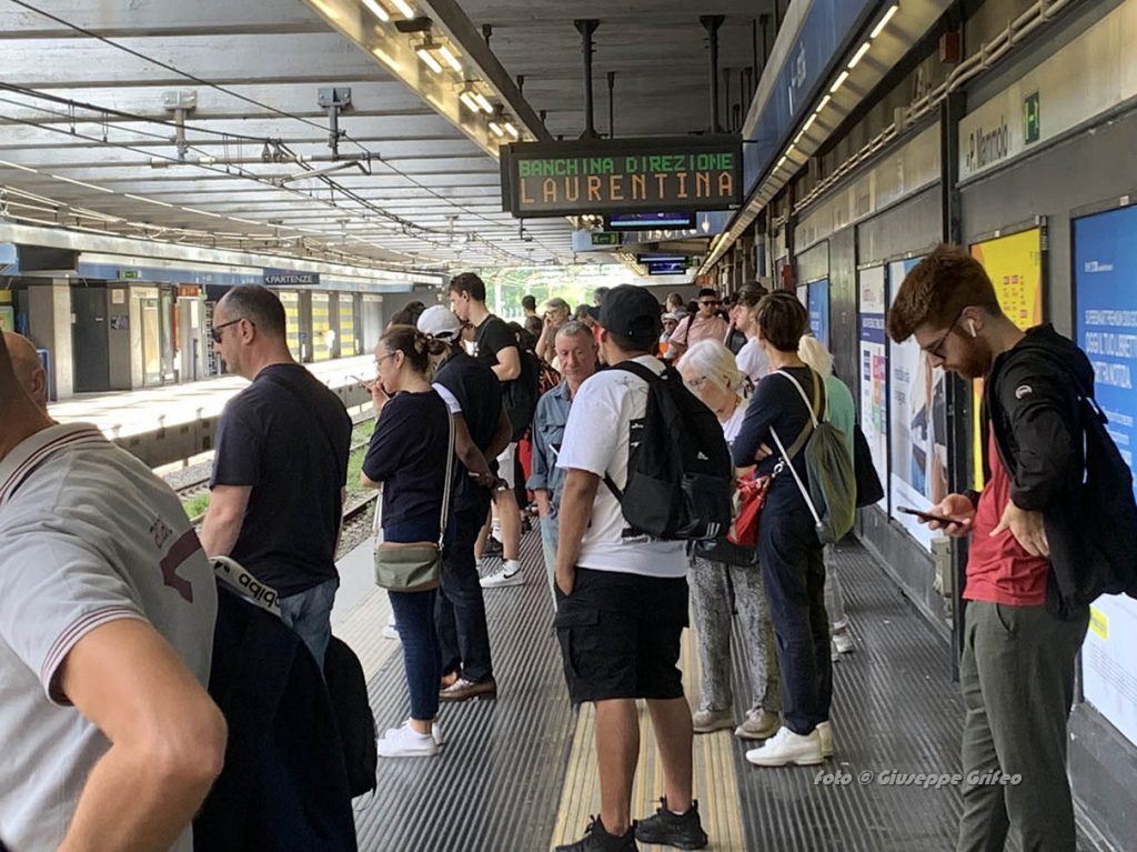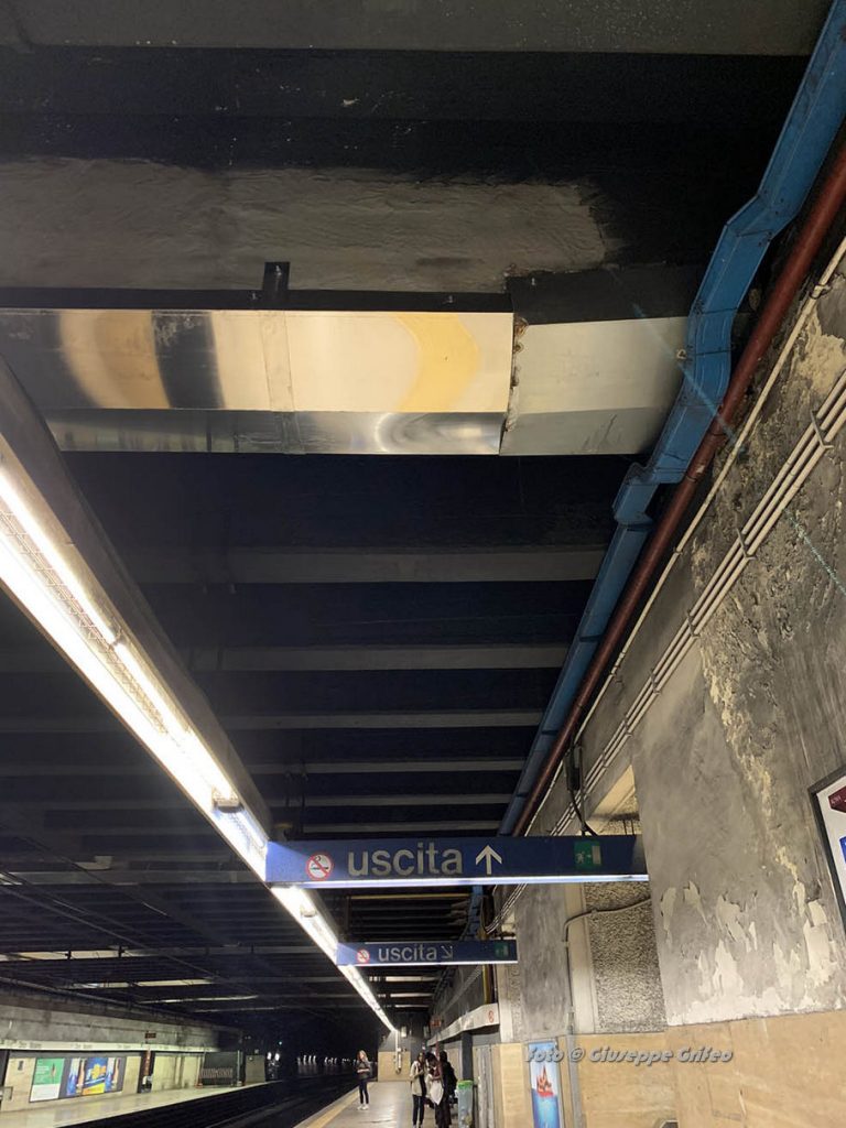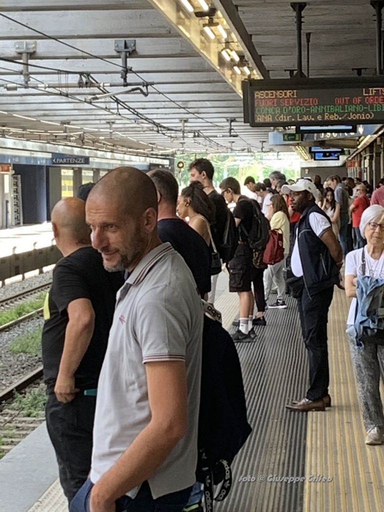 Alle ore 12,36 inizio a scattare qualche foto. Nei 10 minuti appena trascorsi ho notato i tabelloni che lanciano continui messaggi sconfortanti: MAI indicano i minuti che ci vogliono all’arrivo del treno; scorre la lista delle fermate dove gli ascensori sono guasti, con buona pace di chi ha difficoltà di movimento, di chi si muove in carrozzina e affini; un altro messaggio piomba dai tabelloni e riguarda i lavori che dal 4 luglio inizieranno sulla Linea A, continueranno nei mesi successivi col servizio Metro che chiuderà alle ore 21 per essere sostituito da bus (sarà puro delirio).