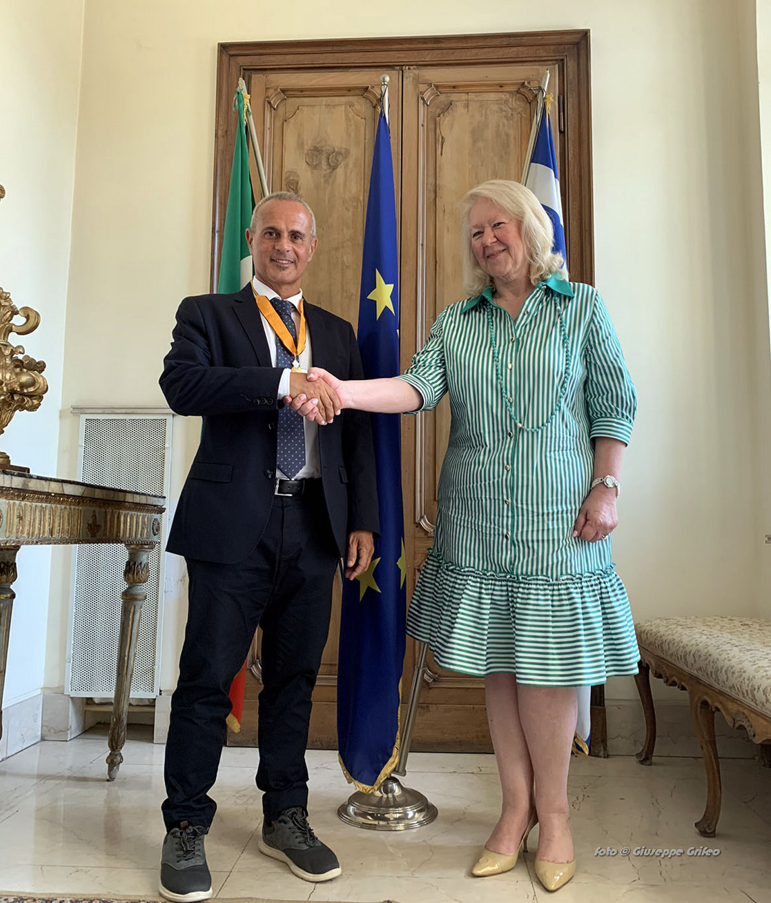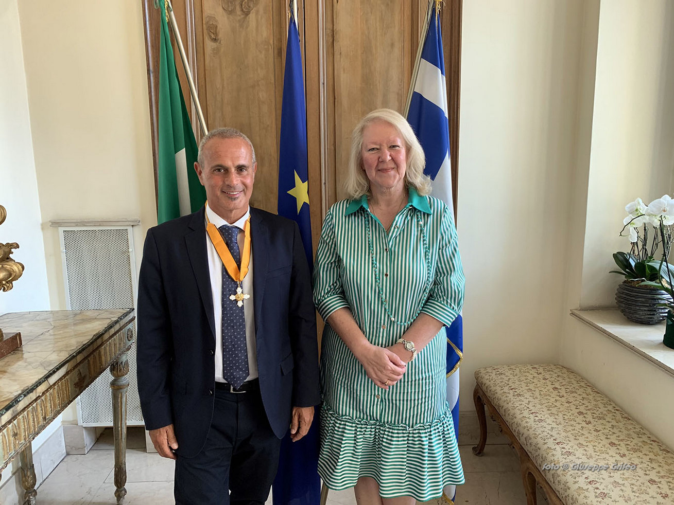 Conversare con l’ambasciatrice Eleni Sourani è stato un vero piacere, anche durante la colazione tenuta in Ambasciata. Confrontarci sulla conoscenza reciproca delle nostre due terre e sorprenderci su quanto di lei c’è del Sud Italia, della Sicilia e del Sud della Puglia e quanto in me c’è di atavicamente greco, cretese e bizantino.