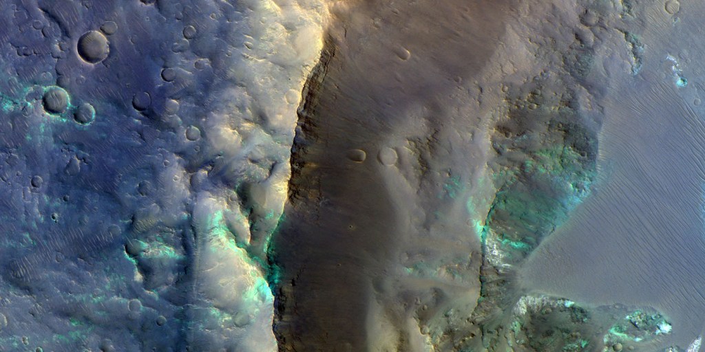 Come raccontato dall’Agenzia Spaziale Europea, i toni più blu sono più coperti di polvere. I colori verdastri sono tipicamente minerali mafici (associazione delle parole ferro e magnesio) o femici come magnesio e/o silicati ricchi di ferro, sebbene sia necessaria la spettroscopia per fornire l’identificazione più accurata. L’immagine è centrata a 333,3ºE/24,5ºS. Il nord è all’incirca a sinistra nell’immagine.