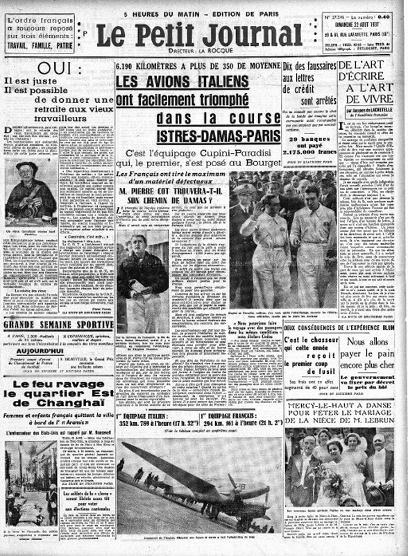 La gara di velocità Istres-Damasco-Parigi vide la partecipazione di piloti italiani appartenenti alla squadriglia dei “Sorci Verdi”, su otto aerei, in prevalenza velivoli S.M.79 CS da competizione sportiva, interpretazione diretta (senza apparati militari, più leggeri e senza la caratteristica gobba) del primo prototipo S.M.79P I-MAGO.