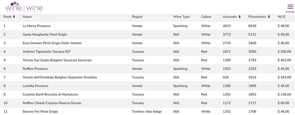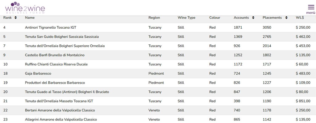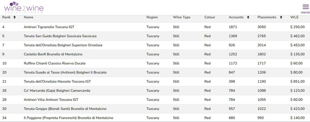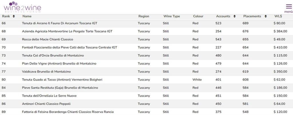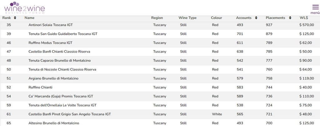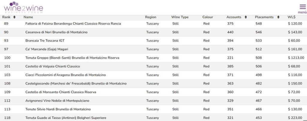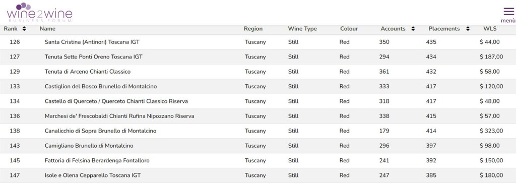 L’analisi ha individuato il posizionamento dei principali 150 vini d’Italia nelle carte dei ristoranti a statunitensi. Scorrendo questa classifica il Consorzio del vino Brunello di Montalcino ha notato che sono 17 le cantine nella lista della ristorazione per un totale di 12.228 referenze in carta e prezzi quasi tutti in tripla cifra: si va infatti da un massimo di 1.213 dollari a bottiglia fino a un minimo di 90.